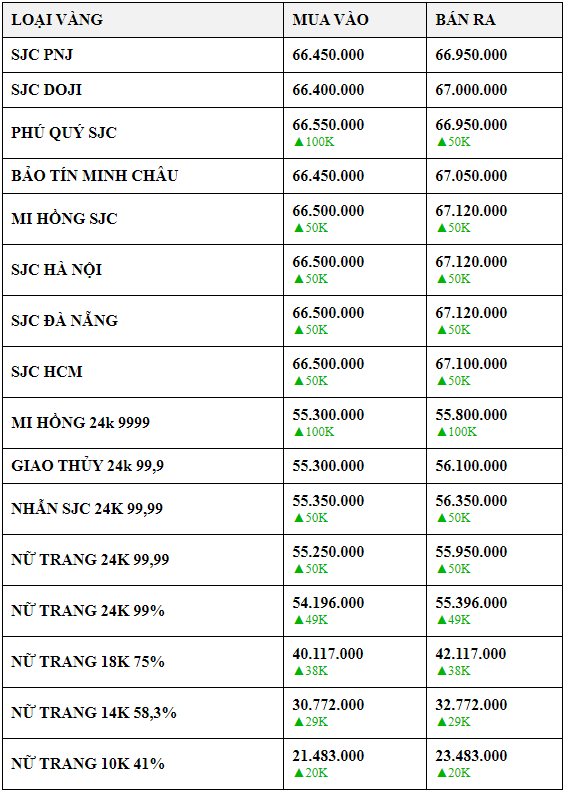 Giá vàng miếng SJC có sự điều chỉnh tăng 50.000 đồng ở cả hai chiều mua và bán, hiện tại mua vào 66.500.000 và bán ra 67.100.000 đồng, chênh lệch ở hai chiều mua bán là 600.000 đồng
